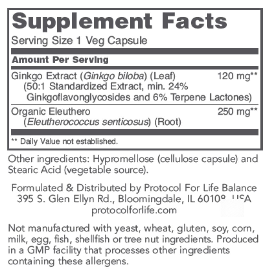 Protocol for Life Ginkgo Biloba is grown and extracted under the highest quality standards and is standardized to min. 24% ginkgoflavonglycosides and min. 6% terpene lactones, including ginkgolide B, ginkgolides A, C and bilobalide. A long history of traditional use and modern scientific research have indicated that ginkgo can help to promote optimal circulation and support brain health. Each capsule contains 120 mg of ginkgo extract and 250 mg of organic eleuthero.