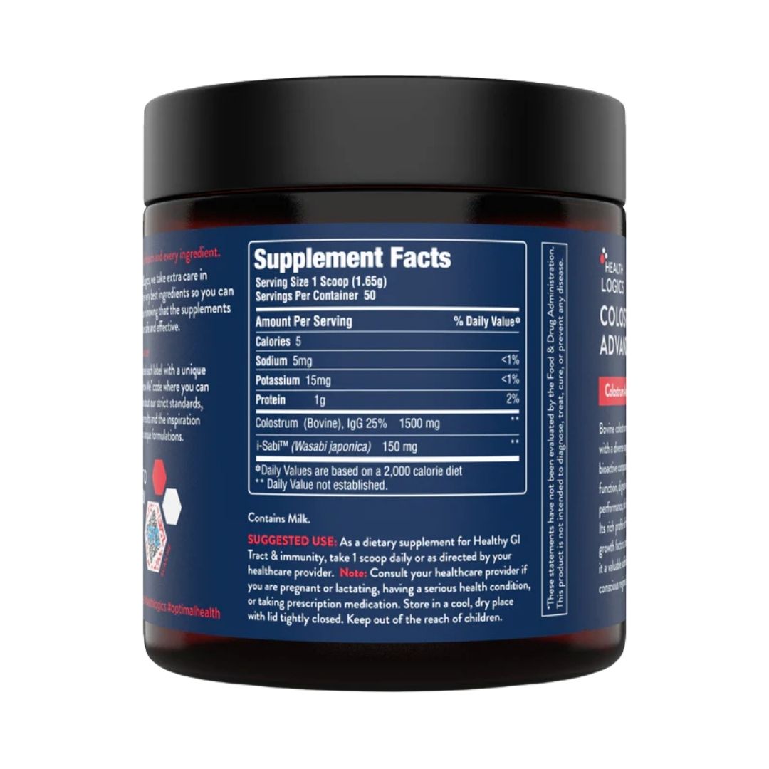 Health Logics Colostrum Advanced combines the immune-boosting power of colostrum with the cellular-protective benefits of iSabi® Wasabi Japonica powder in one groundbreaking formula. Specifically designed for those seeking optimal health, Health Logics Colostrum Advanced unique blend additionally offers synergistic support for your immune system, gut health, and cellular defense mechanisms.